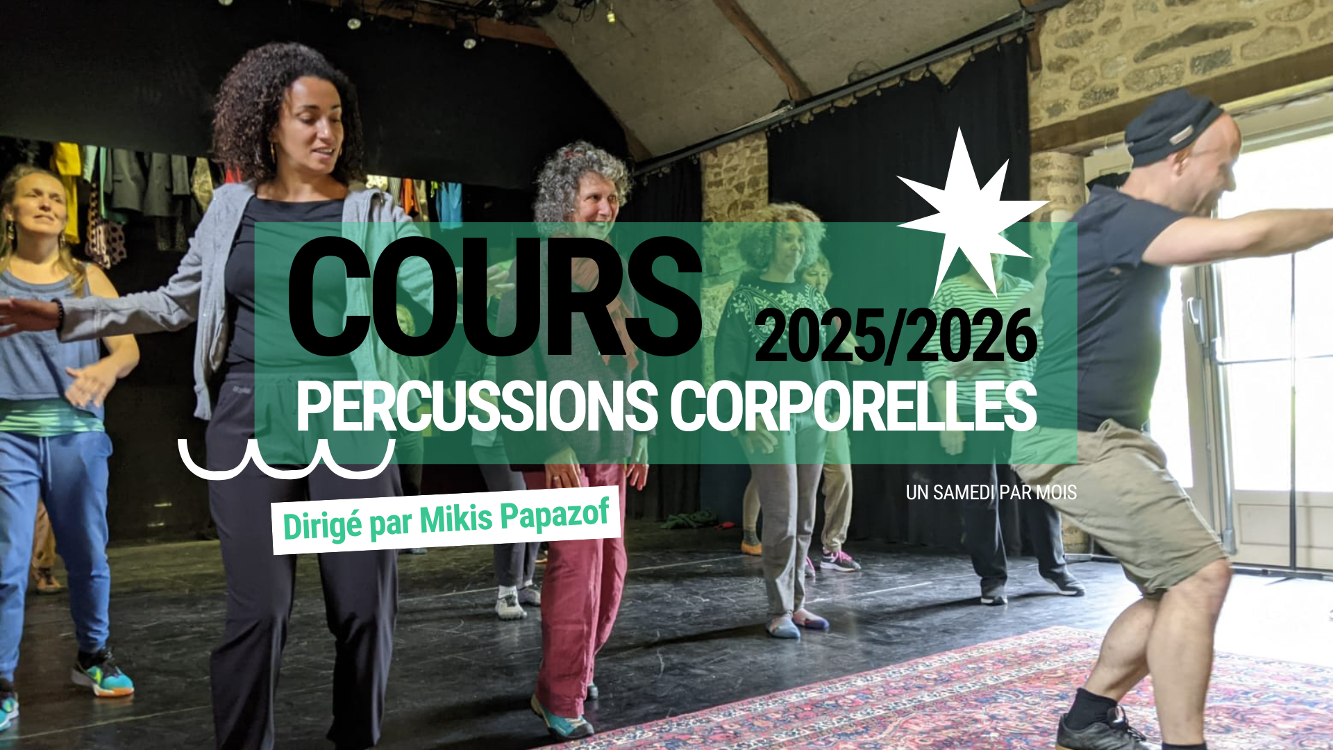D'octobre à juin (9 séances) Cours dirigé par Mikis Papazof À partir de 16 ans Prérequis : avoir déjà participé à un stage de percussions corporelles (bodypercussion) Plus d'infos ! |